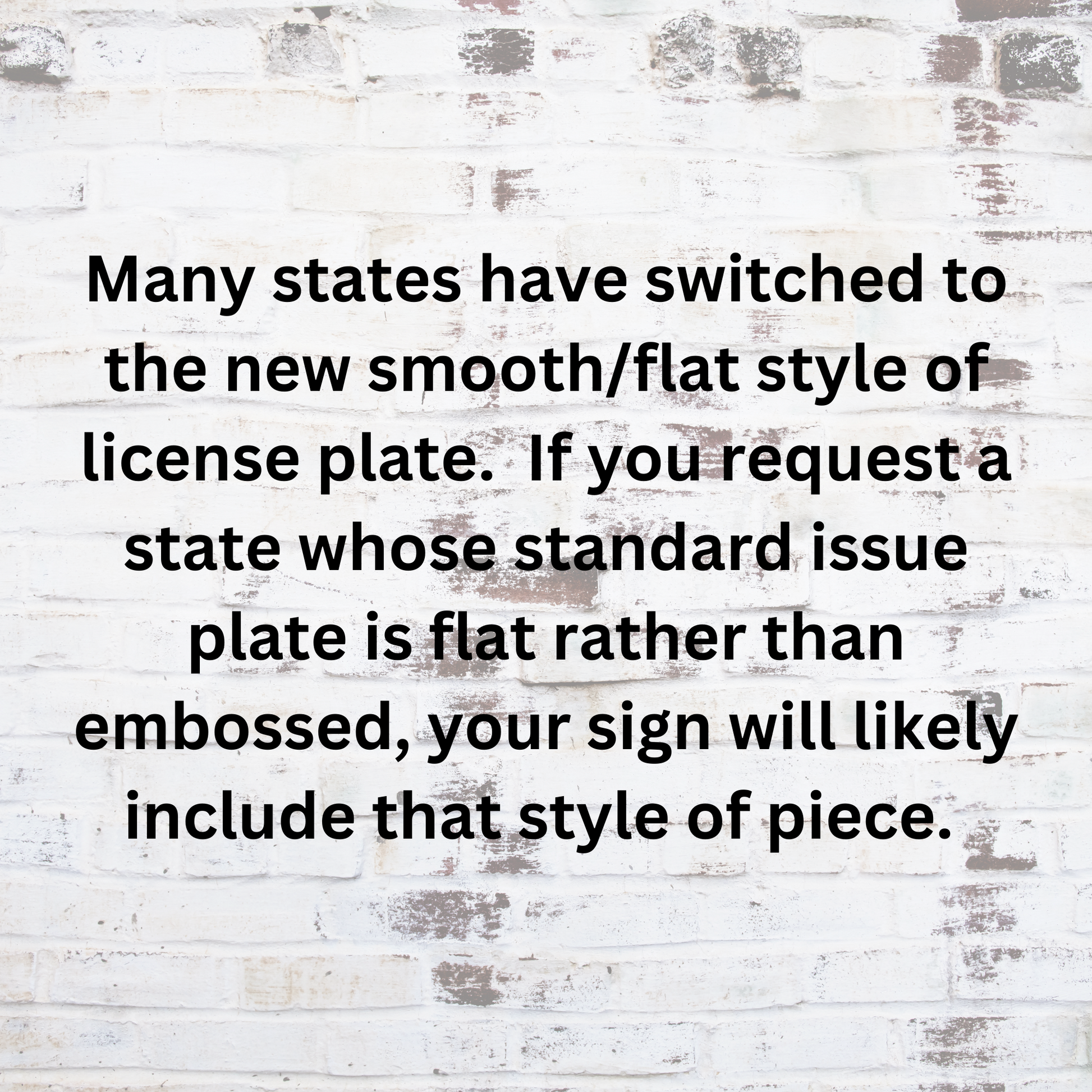 -The letter will have a portion of the state's name on it, likely cut from the middle portion of the plate where most state names appear, and will have a matching rounded piece attached at the beginning and end (as shown in the many example photos). May have a portion of a letter, one letter, or a couple of letters from the state's name on the piece, depending on the state's plate design.